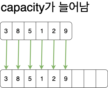 실제로는 가지고 있던 용량이 꽉 찼을 때, 용량이 기존의 1.5배를 늘린 새로운 배열에 기존 배열을 copy하는 것이다.