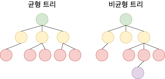 '균형 트리'란 루트로부터 리프까지의 거리가 일정한 트리 구조를 뜻하는 것으로, 트리 중에서 특히 성능이 안정화 되어있다.