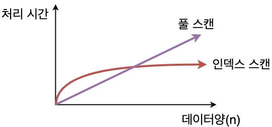 풀 스캔이 테이블의 크기에 비례하는 형태로 실행 시간이 늘어가는데에 비해 인덱스를 사용한 경우 실행 시간의 저하는 보통 원만한 곡선을 그리게 된다.